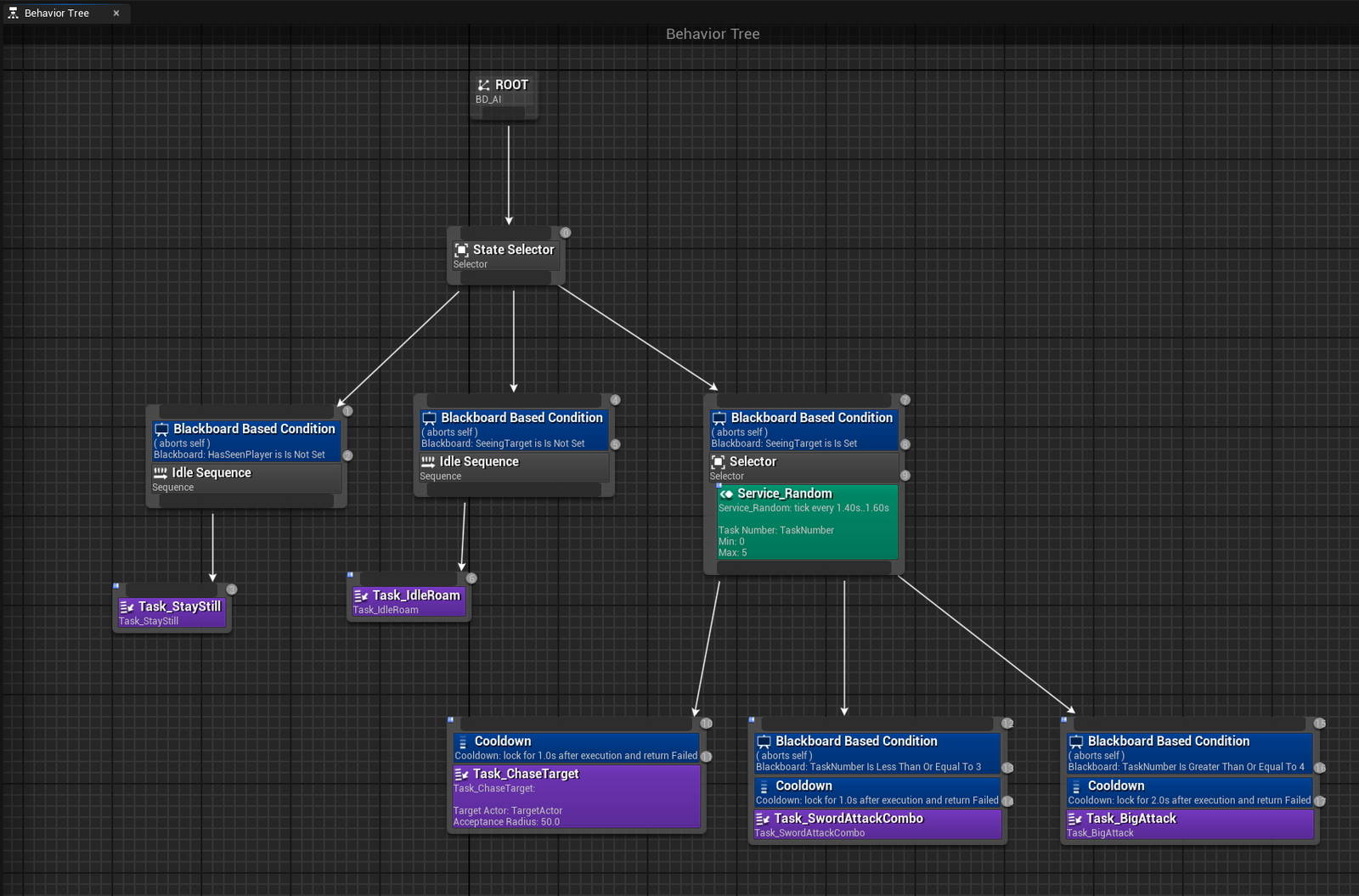 The enemies are controlled by behavior trees, where basic enemies have one kind of behavior and the bosses have a more advanced tree. Each enemy has an idle behavior, a chasing behavior and a combat behavior.