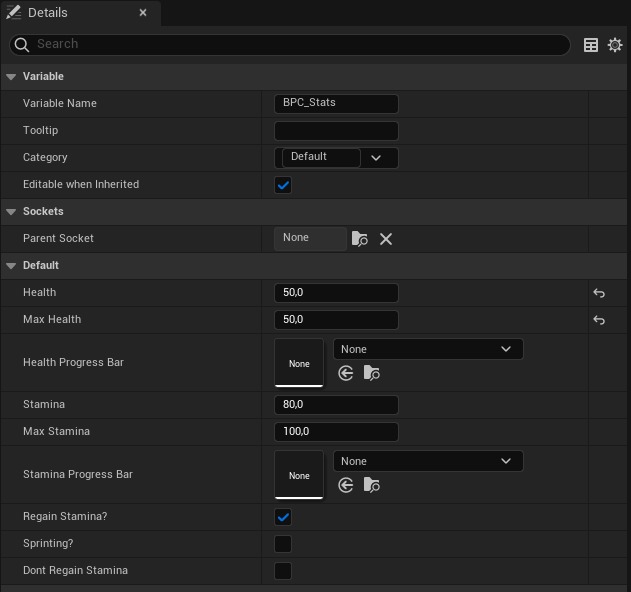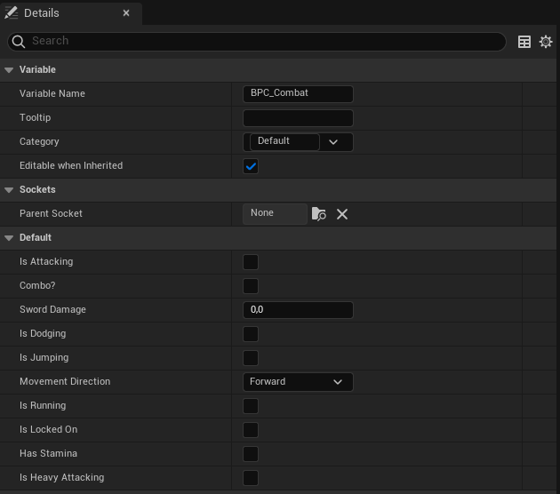 The core feature in most souls-like games is the combat. In order to make all aspects of the combat modular I worked with blueprint components that could be applied to both the player and the enemies. The values inside these components could then be changed for different enemy types independent of each other.