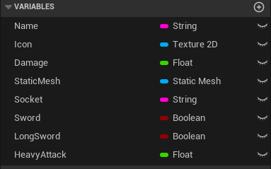 The weapons were created by using a data asset where I added the variables needed, such as a mesh reference and damage. These variables could then be changed when creating a new data asset using this parent class.